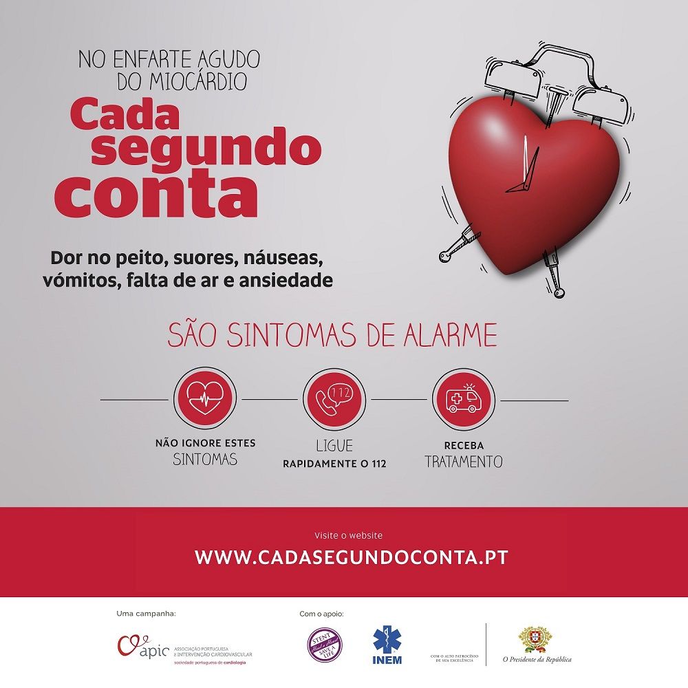 Com os objetivos de promover o conhecimento e a compreensão sobre o enfarte agudo do miocárdio e os seus sintomas; e alertar para a importância do diagnóstico atempado e tratamento precoce, a APIC desenvolveu a campanha de consciencialização “Cada Segundo Conta”, que conta com o apoio do Instituto Nacional de Emergência Médica (INEM), do Alto Patrocínio do Presidente da República e da iniciativa Stent Save a Life, da APIC. Para mais informações consulte: www.cadasegundoconta.pt