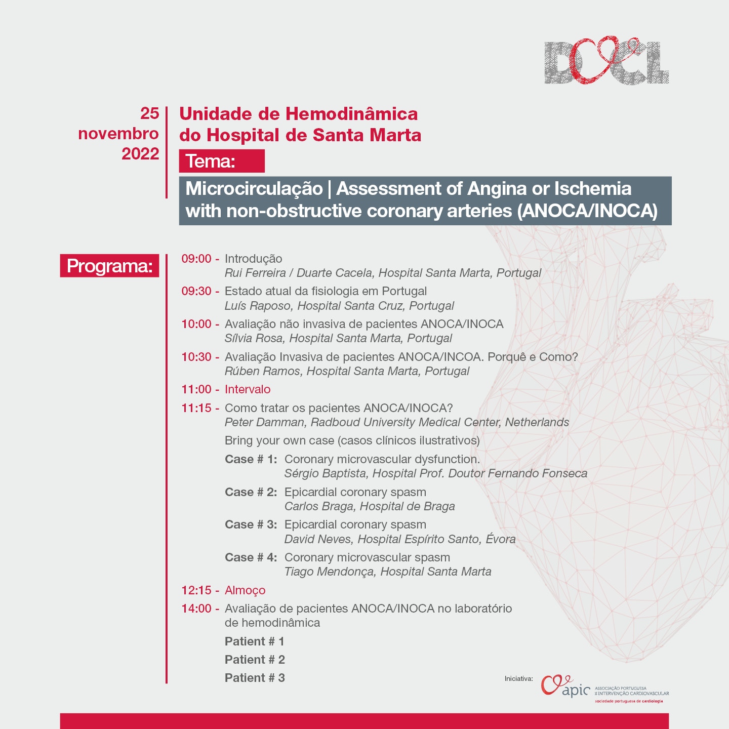 Segundo Rúben Ramos, cardiologista de intervenção no Hospital de Santa Marta e responsável do programa deste D@CL: “Este D@CL terá um formato misto, teórico e prático. Na primeira parte teremos um fórum de discussão onde os convidados farão curtas comunicações sobre o atual panorama do estudo invasivo ANOCA em Portugal, discussão de métodos invasivos e não invasivos e perspetivas atuais e futuras de tratamento. Na segunda parte, mais prática, estaremos no laboratório para aplicar um protocolo compreensivo e sistematizado de estudo invasivo em três doentes com ANOCA”.