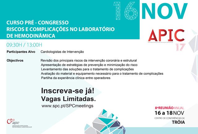 Estão abertas as inscrições para o curso “Riscos e Complicações no Laboratório de Hemodinâmica”, a realizar na manhã de 16 de novembro, no âmbito da 8ª Reunião Anual da APIC.